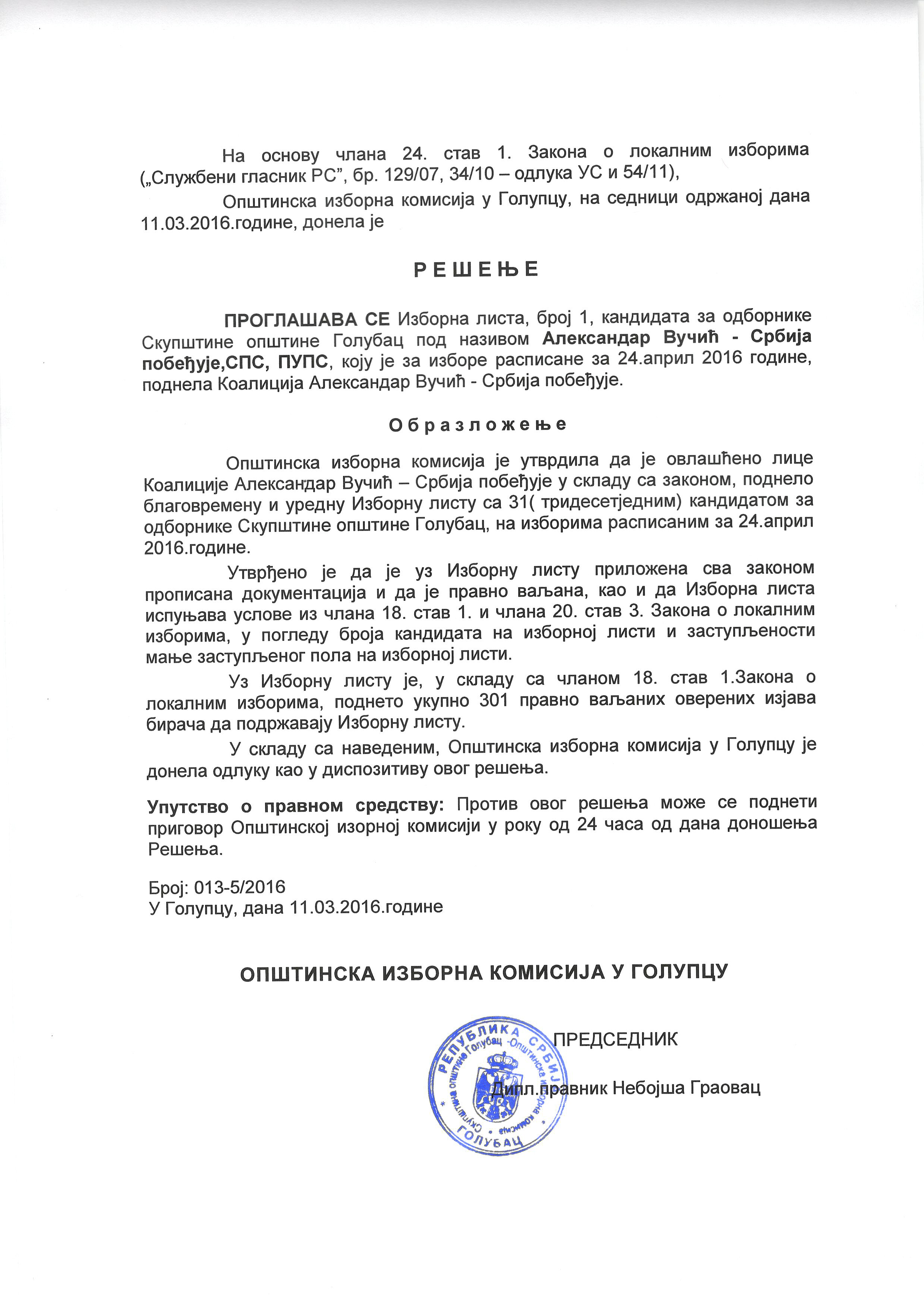 - РЕШЕЊЕ – ИЗБОРНА ЛИСТА БРОЈ 1 – КАНДИДАТА ЗА ОДБОРНИКЕ СКУПШТИНЕ ОПШТИНЕ ГОЛУБАЦ
