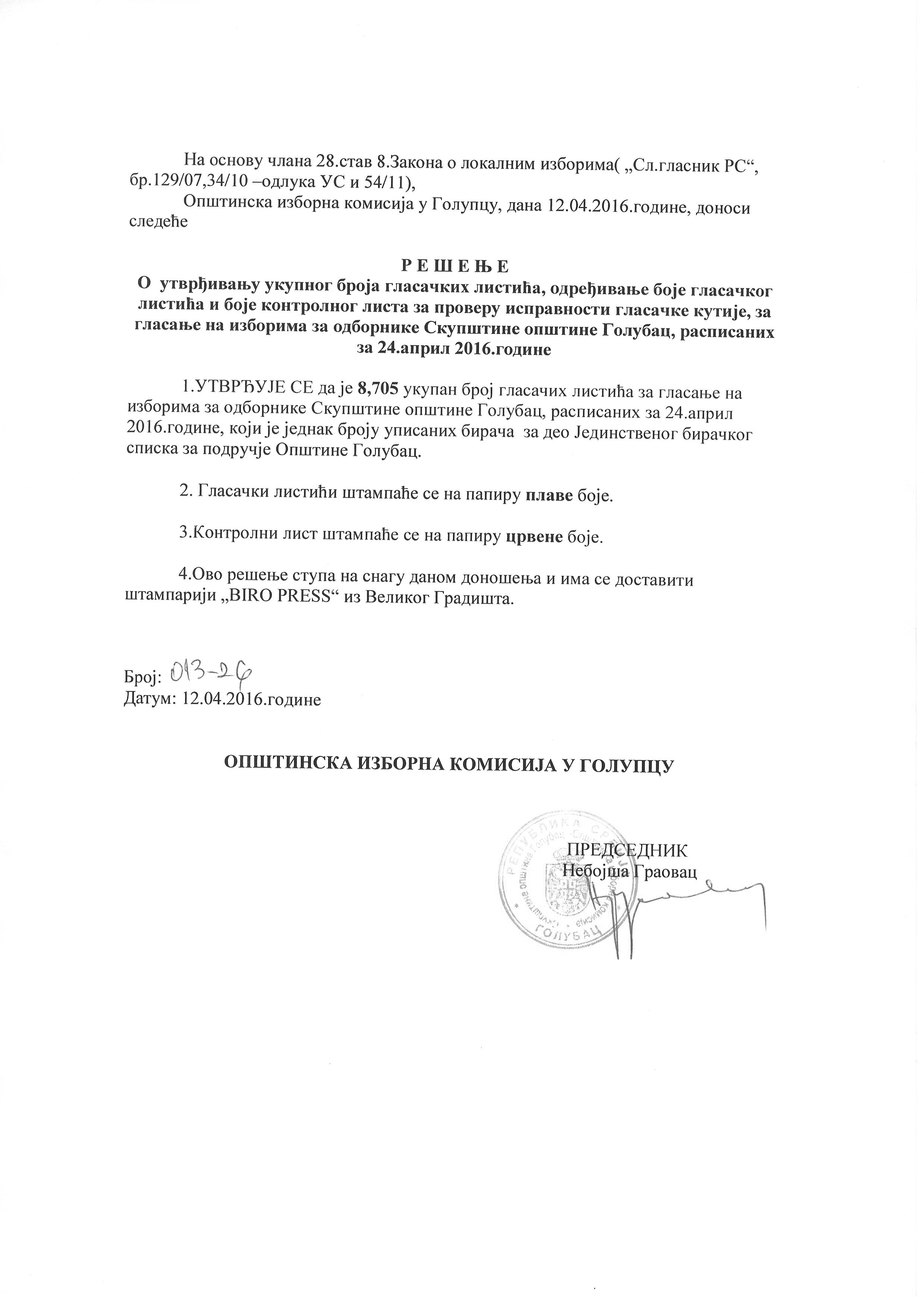 - РЕШЕЊЕ – О УТВРЂИВАЊУ УКУПНОГ БРОЈА ГЛАСАЧКИХ ЛИСТИЋА, ОДРЕЂИВАЊЕ БОЈЕ ГЛАСАЧКОГ ЛИСТИЋА И БОЈЕ КОНТРОЛНОГ ЛИСТА ЗА ПРОВЕРУ ИСПРАВНОСТИ ГЛАСАЧКЕ КУТИЈЕ, ЗА ГЛАСАЊЕ НА ИЗБОРИМА ЗА ОДБОРНИКЕ СКУПШТИНЕ ОПШТИНЕ ГОЛУБАЦ